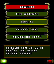 - 5 типов игры: дедматч (Deathmatch) командная игра (команда против команды) выжить (Survive) захват флага (Capture the Flag) последний герой (Last Hero)