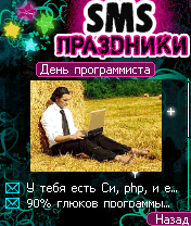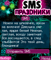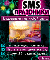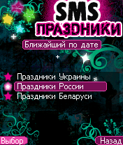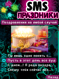- Более 900 SMS на все праздники - 92 Раздела - Кол-во тематических поздравлений: Профессиональные праздники (277) Общие (267) Личные (196) Розыгрыши (179) - На каждый день, 356 дней в году (Нет повода не выпить) - Праздники текущей или ближайшей даты! - Все праздники: Украины, России, Беларуси Модные По профессиям Твои личные Народные Красный день календаря Религиозные SMS-розыгрыши Нет повода не выпить - Красочное и анимированное оформление - Возможность отправки мгновенно SMS - Чтение номеров с записной книжки телефона - История отправленных SMS - Различные настройки интерфейса