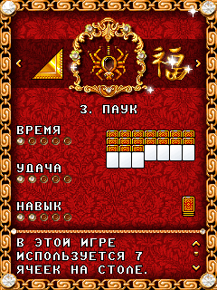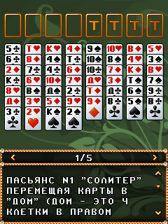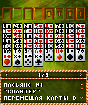 - полная поддержка Сенсорных/Touch Screen/Stulus телефонов; - 12 лучших Пасьянсов в одной игре: «Косынка» «Солитер» «Паук» «Восточная гавань» «Китайский» «Муравьиный» «Ковер» «Аляска» «Белая лошадь» «Гольф» «Касатка» «Юкон»